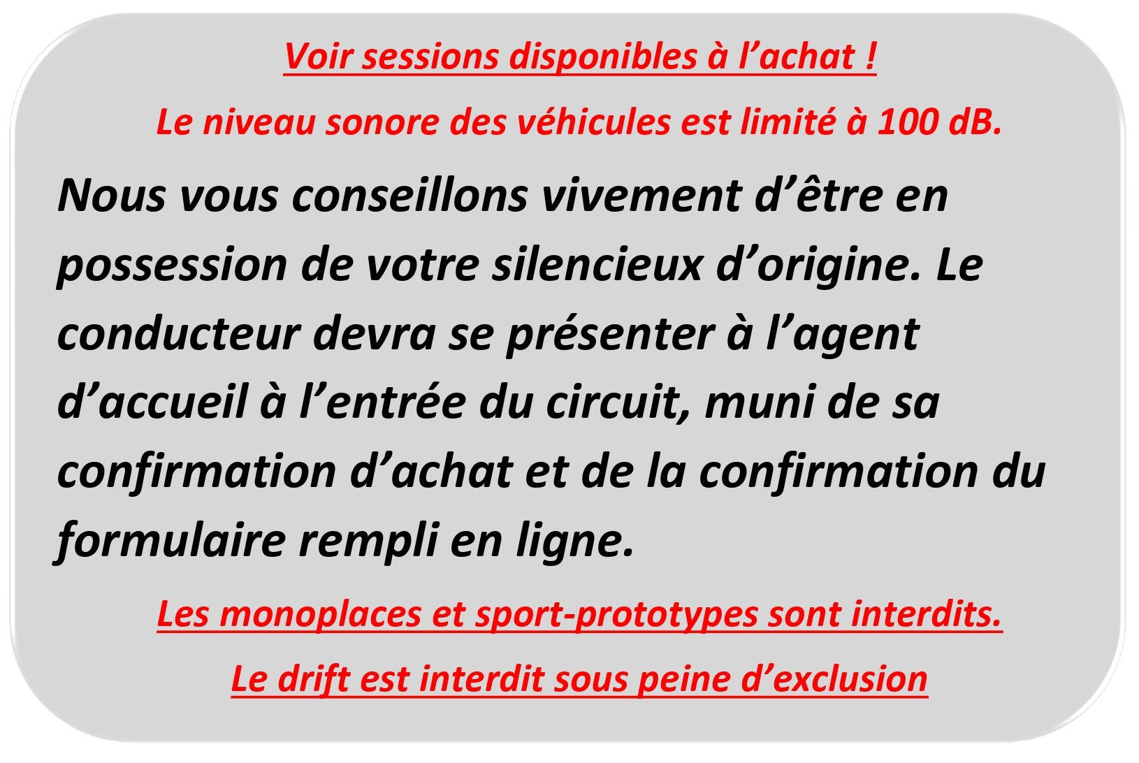Session non remboursable en cas d’annulation du conducteur, aucune prolongation ou report n’est possible